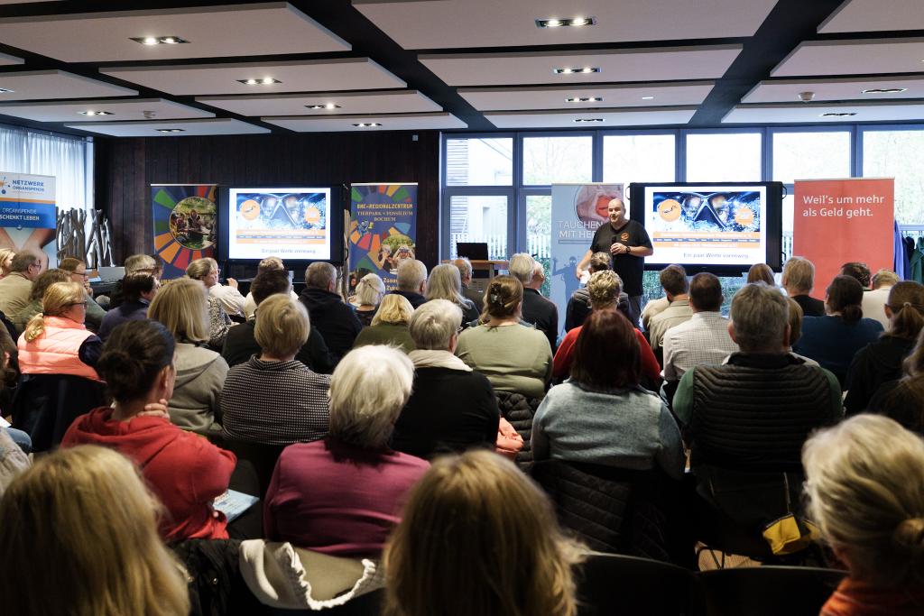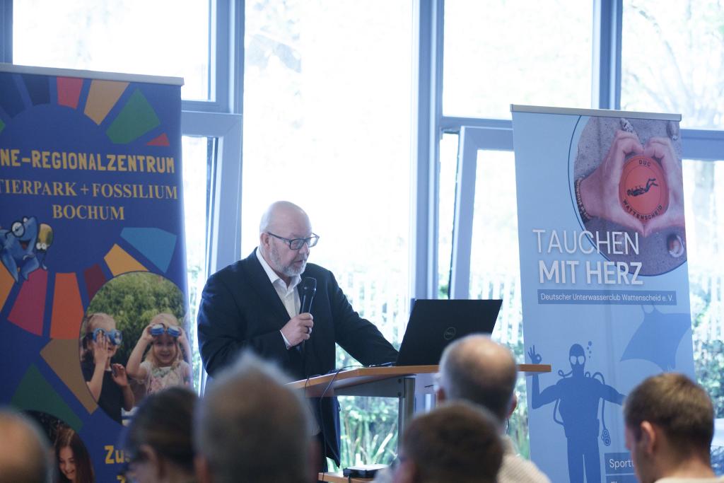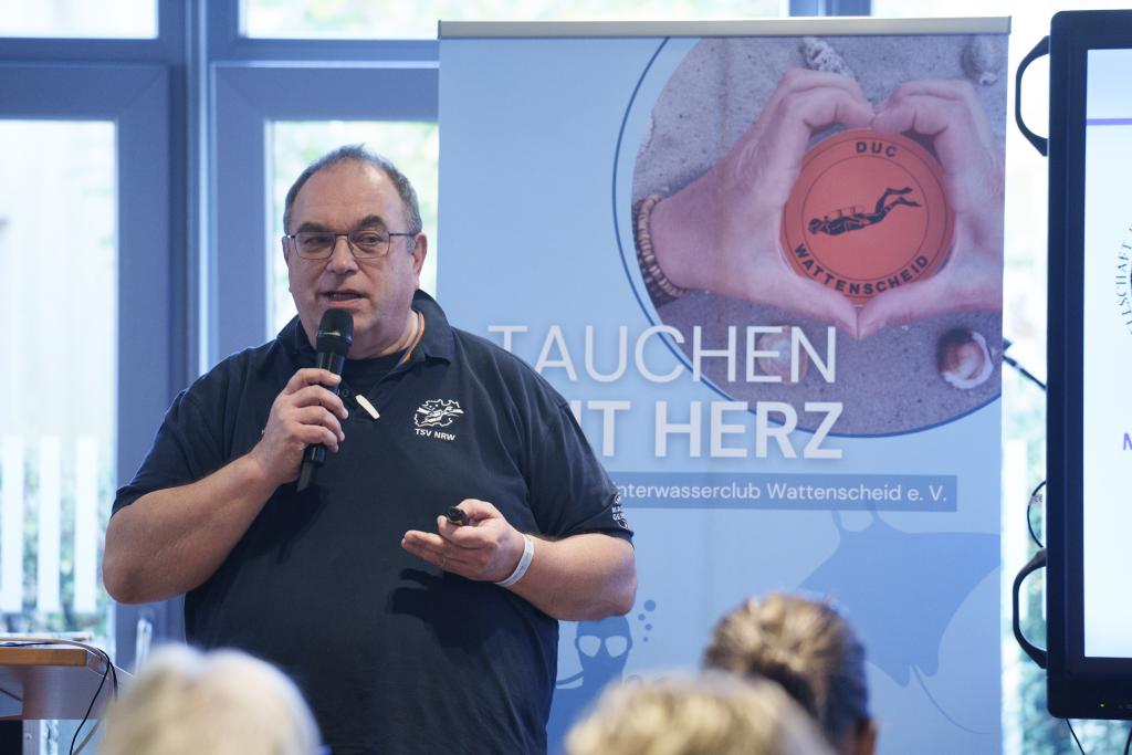 Auch die Auswirkungen des Klimawandels auf unsere heimischen Gewässer kamen nicht zu kurz: Dr. Peter van Treeck zeigte anschaulich, wie Temperaturveränderungen Tiere, Pflanzen und Lebensräume beeinflussen – und was das langfristig für den Tauchsport bedeutet.