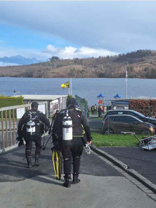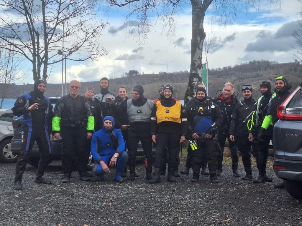 Treffpunkt war der Wintertauchplatz Sorpesee. Dort haben sich unsere hartgesottenen Taucher*innen für ihren ersten Tauchgang im Sorpesee aufgerödelt. Drei Taucher*innen waren so mutig und sind sogar ohne einen Trockenanzug in die Sorpe eingetaucht. Die Sorpe hatte schätzungsweise 3 Grad. Das nenne ich Tauchleidenschaft…
