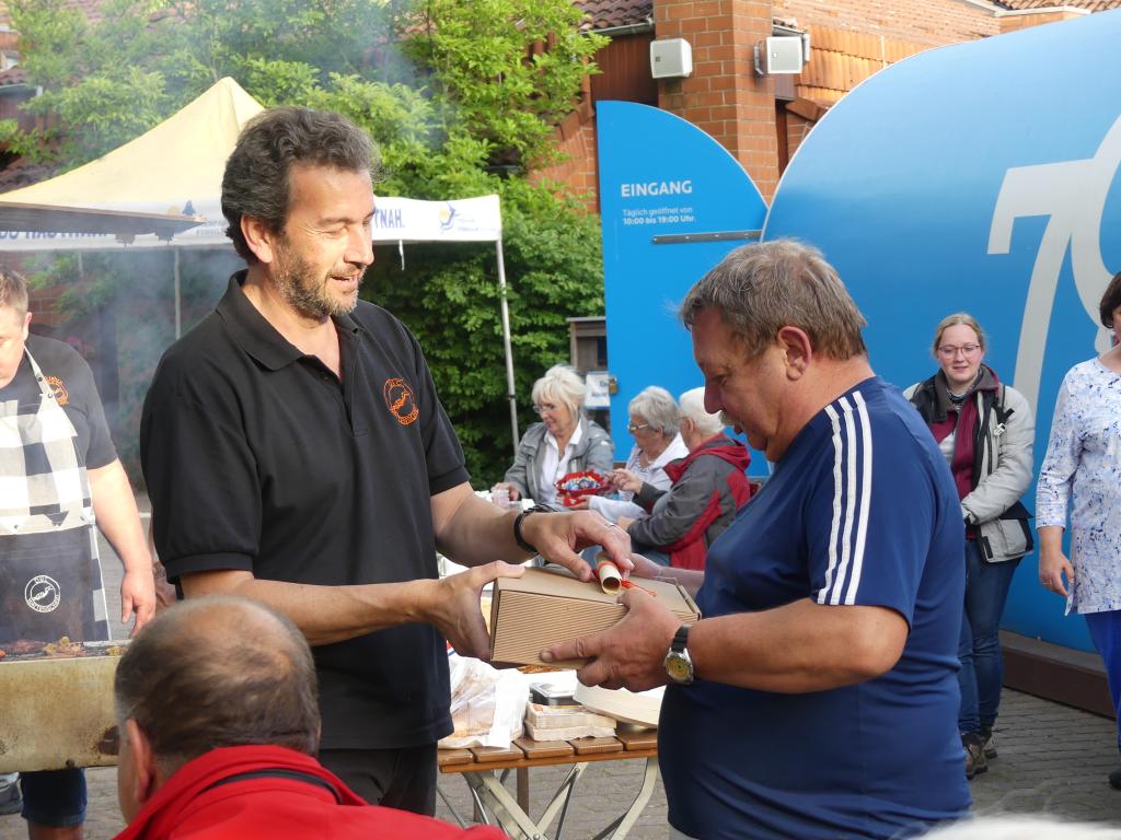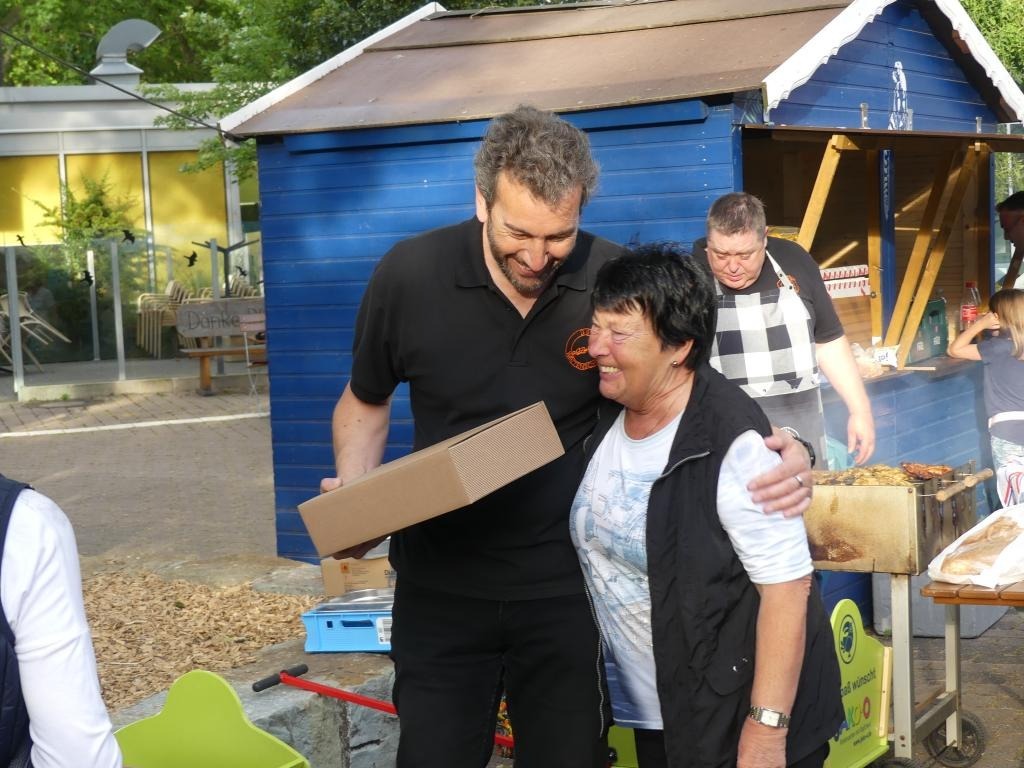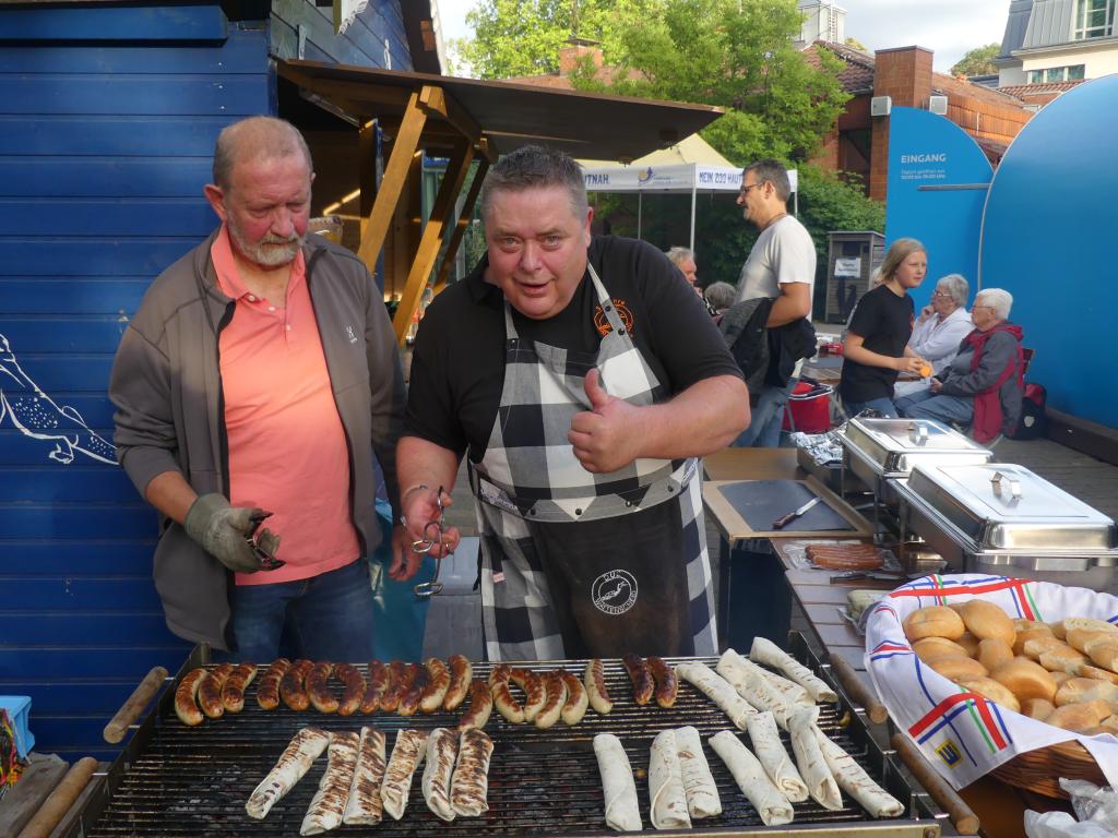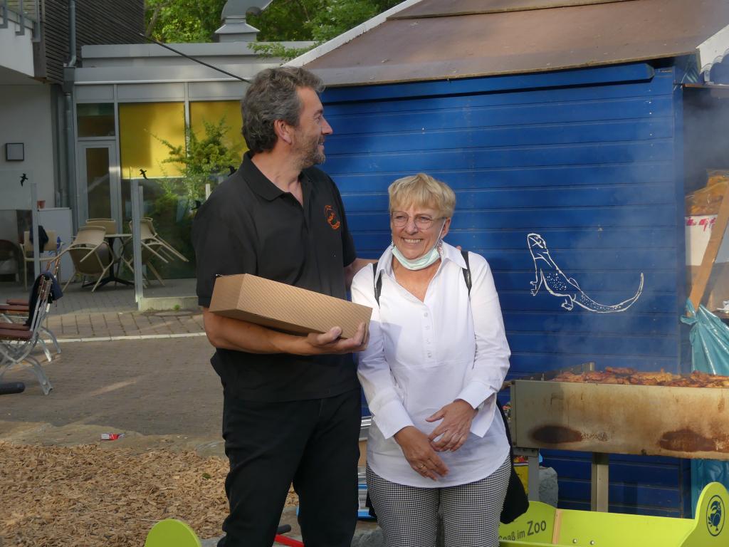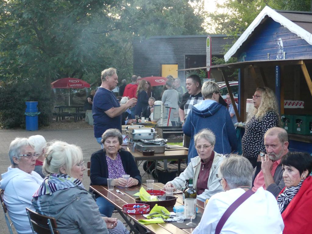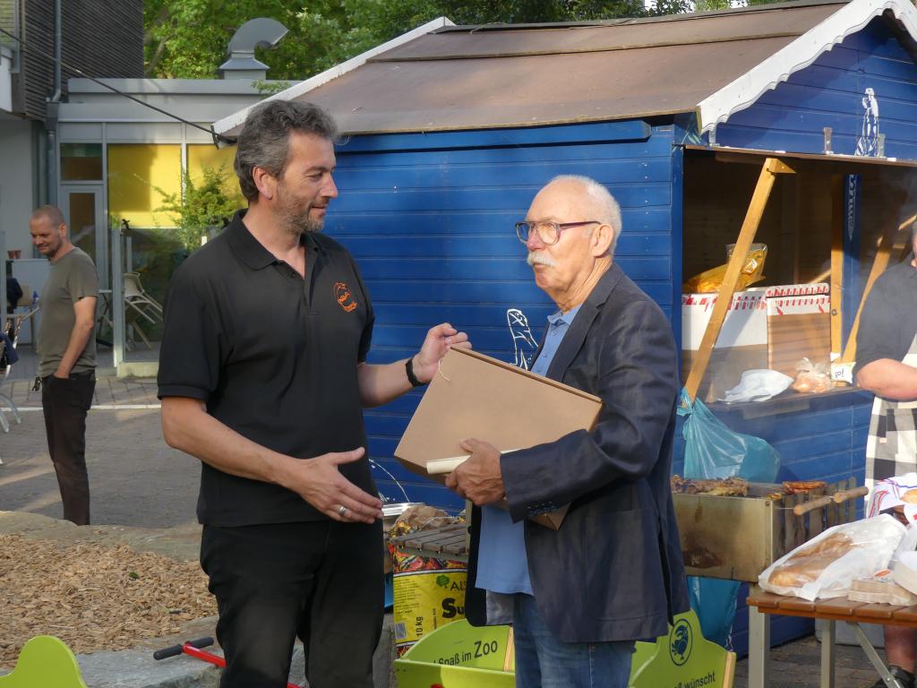 Bei schönem Wetter fanden sich jung und alt im Eingangsbereich des Parks ein, wo zwischen Flamingogehege und Aquarium die Tische und Bänke aufgebaut wurden. Highlight des Abends waren die Ehrungen, die durch unseren Vorsitzenden Trevor feierlich vergeben wurden. Durch die coronabedingte Auszeit gab es einige Ehrungen nachzuholen: in den letzten zwei Jahren hatten sich einige Vereinsjubiläen angesammelt, die nun endlich gebührend gefeiert werden konnten.