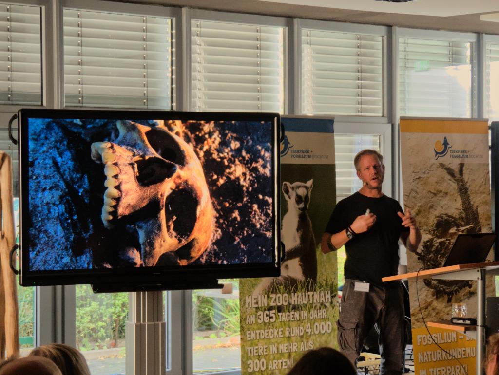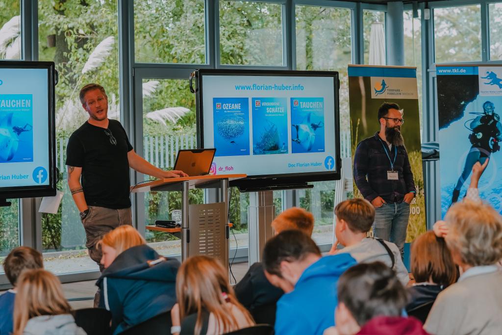 Nach einer Mittagspause mit Currywurst und der Möglichkeit, den Tierpark zu erkunden, ging es schließlich zum bildgewaltigen Hauptvortrag des Tages: Dr. Florian Huber, Unterwasserarchäologe und Forschungstaucher, nahm die Gäste mit auf eine spannende Reise zu Schiffswracks, Maya-Friedhöfen und prähistorischen Ruinen in den Gewässern rund um den Globus.