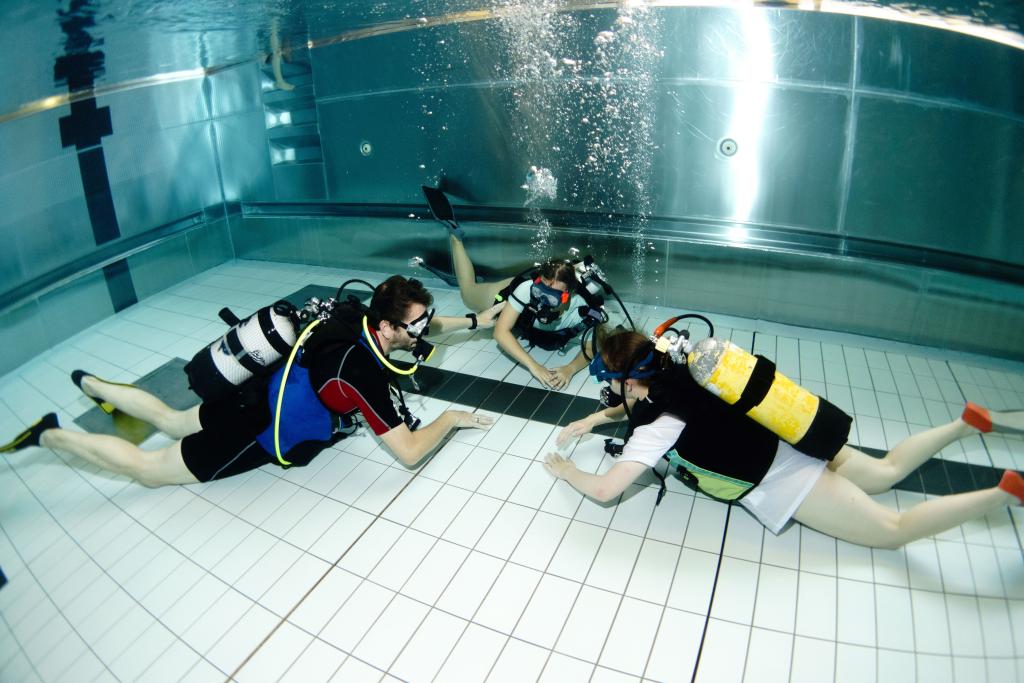 Im Schwimmbad des Sportzentrum Westenfeld in Wattenscheid wurden Ashley, Jonas, Kim und Lucia und ihre Begleiterinnen von den Übungsleitern des DUCs herzlich empfangen und in die Grundlagen des Tauchsports eingeführt. Nachdem die Tauchgeräte zusammengebaut und alle mit Ausrüstung versorgt wurden, ging es dann ins Wasser. Zuerst wurde im flachen Teil des Beckens das Atmen aus der Flasche und das Bedienen der Tarierweste geprobt, bevor auch das tiefe Wasser unsicher gemacht wurde.