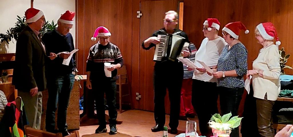 lm Gänsereiter-Saal des Kolpinghauses Höntrop fand die 21-köpfige Gruppe einen idealen Ort, um einen herrlichen Abend zu verbringen. Berry, seine Frau Annelie und seine Schwester Bärbel dekorierten den Saal im Vorfeld mit Kerzen, Tannenzweigen und allerlei weihnachtlicher Deko, sodass die Gäste ein schönes Ambiente erwartete.